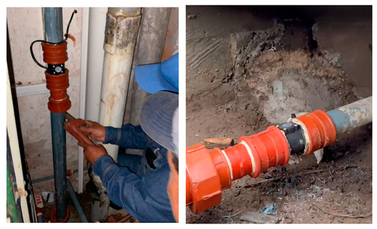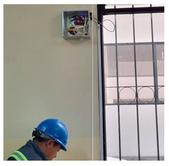 Previously, only one IoT device was available in the administrative building. However, the implementation of another similar device was carried out in Block B (Figure 3 and Figure 4), with the collaboration of students studying Installations in Smart Buildings, who were supervised by Engineer David Carrera, PhD. The devices were synchronized with the online platform https://thingSpeak/ and http://thinger.io/ (accessed on 30 July 2024) and a verification of the condition of the pipes in Blocks A, B, C, and D was carried out. In addition, the availability of the Wi-Fi network was evaluated to avoid possible data loss due to a poor signal. A verification of the diameter of the pipes was also carried out to ensure compliance with the technical specifications [13].