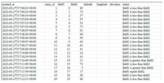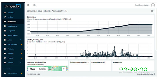In real time, the flowmeter measures the flow of water every 20 s, then the real-time data obtained are saved and monitored through the thinger.io platform, in which it is possible to identify failures in the measurement or disconnection of the equipment (Figure 6).