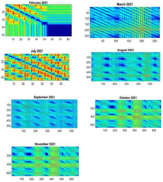 With such data, time series, recurrence maps, and comparative graphs of consumption in days, months, or hours can be created, as was the case in 2021, in the study carried out by engineer Rodney Garcés and engineer David Carrera Villacrés PhD. [2], for which the map of recurrences for February–November 2021 is presented (Figure 9).