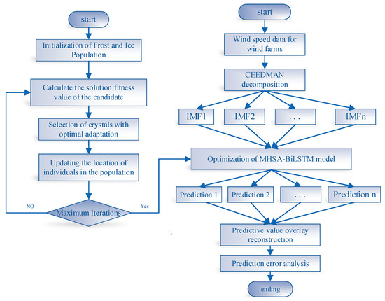 Steps of CEEMDAN-RIME-MHSA-BiLSTM wind speed combination prediction algorithm.