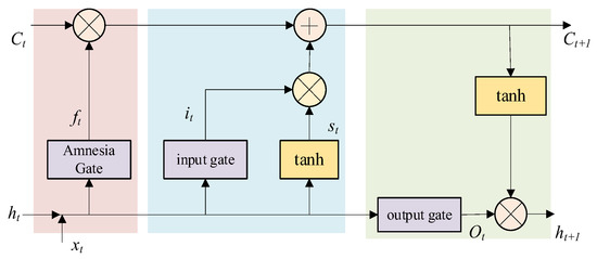 The LSTM structure includes the input data (), storage cell state (), hidden state (), forgetting gate (), input gate (), and output gate (). The forgetting gate selectively discards weakly relevant information in the timing data, the input gate updates the state of the storage cell, and the output information is determined by the output gate [39]. The execution of the LSTM updating of the internal cell is as follows: