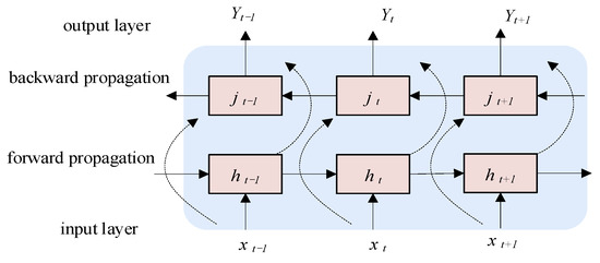 - The input data are passed for processing in the first-layer BiLSTM, which has neural units containing both forward and backward LSTM. The first-layer BiLSTM processes the data between the time steps and ; the output of the forward LSTM at time step t is and the output of the backward LSTM is . The outputs of the two directions are concatenated at each time step to form the output of the first layer (i.e., the dimensional vector ());