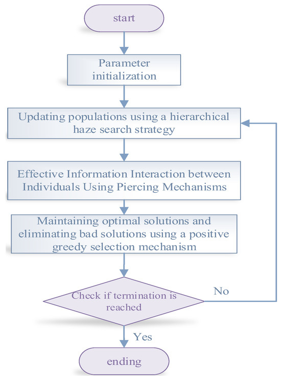 In the initialization phase of the frost ice cluster, the algorithm initializes a set of initial solutions, which are usually randomly generated. These solutions constitute the initial “Frost Ice Cluster” (i.e., a set of candidate solutions in the solution space). In the soft-frost search strategy phase, the algorithm searches for solutions in the solution space using a soft-frost search strategy. Based on the soft-frost search strategy, the algorithm introduces a hard-frost puncturing mechanism to accelerate the search process and improve the efficiency of the search. The hard-frost puncture mechanism is like the puncturing of the frozen frost ice layer, and some special operations are performed to search deeply for the local optimal solutions in the solution space. The last stage is an improved greedy selection mechanism for selecting the optimal solution from the solutions obtained from the search [43]. This mechanism usually selects the optimal solution based on the value of the objective function or those of other metrics and uses it as the output of the algorithm. The flowchart of the RIME algorithm is shown in Figure 4.