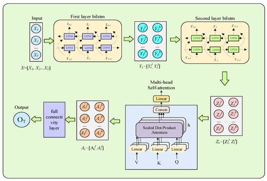 When dealing with time series data, BiLSTM models are widely used because of their ability to capture the backward and forward dependencies of sequence data. However, when dealing with long sequence data, it may be difficult to effectively characterize long-distance temporal dependencies using BiLSTM, resulting in an insufficient ability to capture key information in the sequence. To overcome this problem, in this study, we adopted the multi-head self-attention mechanism to improve the BiLSTM model framework, aiming to enhance the model’s ability to characterize long sequence data and improve the prediction accuracy. The model framework mainly comprises an input layer, two BiLSTM layers, a multi-head self-attention mechanism, a fully connected layer, and an output layer. The model architecture is shown in Figure 5.
