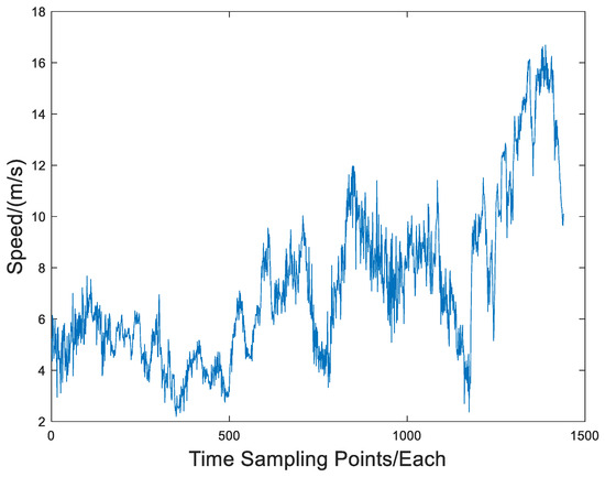 The spatial and temporal variations in wind speed are complex and show obvious seasonal characteristics. In this study, the wind speed data of a wind farm in Inner Mongolia for different time periods in the four seasons in 2023 were selected as the sample dataset. The data were sampled from 0:00 to 24:00 locally and collected every minute, with a total of 5760 samples. To ensure the validity of the model training and testing, the collected data were processed with outliers. Then, the sample data were divided into training and testing sets in a ratio of 7:3, ensuring that the model achieved accurate predictions. In addition, the official website of Iowa State University was used to obtain the wind speed data of a wind farm in the United States to facilitate the comparative study. The following experimental simulations were completed on the Matlab R2021a platform. The raw data had high volatility, as did the measured wind speed data on 20 March 2023. The raw wind speed is shown in Figure 6 as an example.