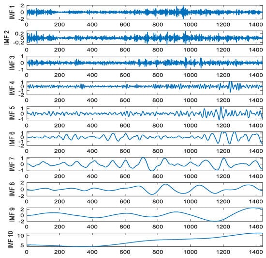 CEEMDAN, proposed by Torres, is a method used for signal processing and data analysis, and is an improvement on and optimization of the empirical mode decomposition (EMD) method. CEEMDAN is suitable for the decomposition of non-smooth and nonlinear signals, and it can better control the magnitude and distribution of noise [33]. Traditional EMD decomposes a complex signal into a series of eigenmode functions, thereby revealing various features and components in the signal. However, EMD is sensitive to noise, which leads to unstable decomposition results when there is noise in the signal [34]. The main idea of CEEMDAN is to introduce positive and negative noise estimation and adaptive parameter tuning based on EMD. This improvement eliminates redundant auxiliary noise and reduces the number of iterations, increases the randomness of the data to mitigate endpoint effects and modal aliasing, and reduces the error after signal reconstruction [35]. The main steps of CEEMDAN are as follows: