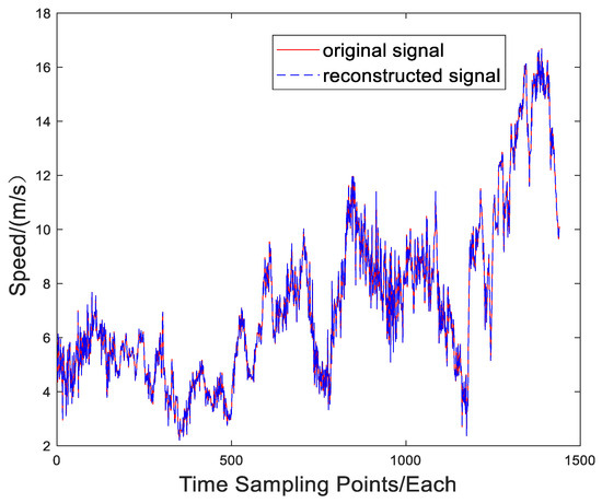 The wind speed series obtained after reconstructing the IMF component of the original signal is shown in Figure 8. The reconstructed signal is smoother and more stable and is highly consistent with the original signal, verifying the effectiveness of the signal reconstruction. By using the CEEMDAN algorithm for decomposition, key periodic features in the signal are successfully retained, while fluctuations are reduced, and harmonic interference is removed. This noise reduction treatment significantly improves the prediction accuracy and overall stability of the model.