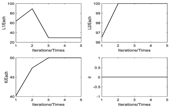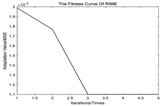 After the CEEMDAN and reconstruction of the wind speed data, the BiLSTM model was used to predict the processed wind speed series. The specific configuration and validation process of the BiLSTM model are described below. The BiLSTM model uses a hidden-layer structure containing 25 neurons with a ReLU activation layer and a regression layer. The model was compiled with the mean square error (MSE) as the loss function, and the initial learning rate was set to 0.005. The number of training times (epoch) was set to 20, and an L2 regularization coefficient of 0.01 was used to prevent overfitting. During the training process, the RIME algorithm was used to adjust the learning rate to optimize the model performance. The RIME optimization curve is shown in Figure 9, which finds the optimal value at two iterations and converges rapidly. The trend of the RIME algorithm in different parameters is shown in Figure 10; all the parameters were stabilized after three iterations.