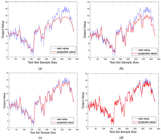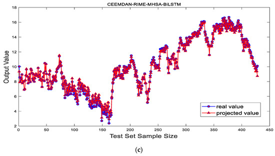 (a) BiLSTM prediction model; (b) CEEMDAN-BiLSTM prediction model; (c) RIME-BiLSTM prediction model; (d) CEEMDAN-RIME-MHSA-BiLSTM prediction model.