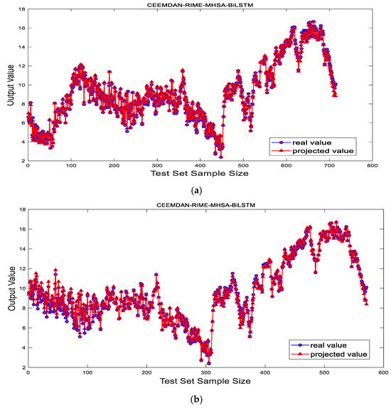 A comparison of the prediction results was performed using evaluation indices, and the evaluation indices for each module of the proposed model are shown in Table 1. From Table 1, it can be seen that BiLSTM was selected as the underlying single model because of the improvement in the prediction performance by adding decomposition. After CEEMDAN, the evaluation indices of the CEEMDAN-BiLSTM model () were reduced by 20%, the was reduced by 17%, and the KMAPE was reduced by 3.64%. After the RIME optimization, the evaluation indices of the RIME-BiLSTM model () decreased by 44%, the decreased by 36%, and the KMAPE decreased by 6.25%. To minimize the error in the hybrid model, decomposition, optimization, and multi-head self-attention mechanisms were incorporated into the BiLSTM model. The optimization results show that the R2 value of the proposed model improved by 10% and 3% compared to the other two hybrid models. Additionally, the prediction curve of this model is closer to the true values, with the NSE increasing by 8% and 3%. Based on these metrics, it can be seen that the proposed combined model has the smallest error in the , , and evaluation metrics and provides accurate and effective prediction results. The results show that RIME optimization and CEEMDAN have a significant effect on the prediction performance of the model. The best prediction results can only be obtained if both are introduced into the model at the same time. CEEMDAN reduces the complexity of the data through multiscale decomposition, while RIME optimization improves the accuracy of the model parameter selection. Both are essential for improving the accuracy of the model over a wide range of predictions.