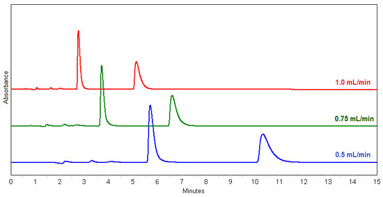 Overlay chromatograms of (±)-ectoine at 0.5 mL/min (method 27, blue); at 0.75 mL/min (method 28, green); at 1.0 mL/min (method 31, red).