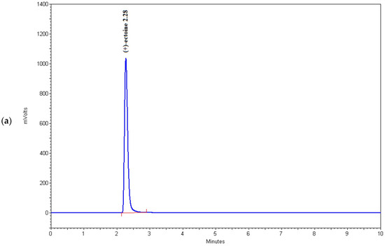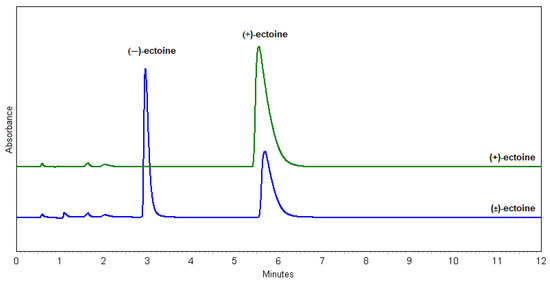 In terms of the resolution (Rs), the best result was obtained with method 23 (MeOH:H2O = 7.5:2.5; Rs = 10.3), but the method 30 (MeOH:H2O = 1:1; Rs = 8.3) was chosen because it uses less MeOH, the flow rate is higher, and the peak shapes are better. This method is optimal for the Chiral-T column in terms of its properties and characteristics. The chosen method is also suitable for a scale-up. Figure 3 shows the identification of (+)- and (−)-ectoine enantiomers compared to standard, natural (+)-ectoine using the selected method 30.