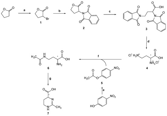 Synthesis of (±)-2-methyl-1,4,5,6-tetrahydropyrimidine-4-carboxylic acid (7): (a) PBr3, Br2; (b) potassium phthalimide, DMF; (c) (1) potassium phthalimide, DMF, (2) acetic acid (conc.); (d) HCl (aq) (1:1, v/v); (e) Ac2O; (f) (1) NaOH, Cu(CH3COO)2 × H2O, acetone, compound 5, (2) quinolin-8-ol, acetone, water; (g) Et3N, n-butanol.