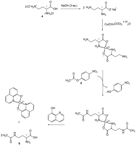 Synthesis of 4-acetamido-2-butyric acid (6): (i) complexation of 2,4-diaminobutyric acid dihydrochloride (4) in base conditions with copper(II)-ions; (ii) selective monoacetylation of 2,4-diaminobutyric acid copper(II)complex with 4-nitrophenylacetate (5) resulting in release of 4-nitrophenol and acetylation of amino groups of copper(II) complex; (iii) reaction with 8-hydroxyquinoline results in copper(II)-quinoline complex and two molecules of monoacetylated diaminobutyric acid (6).