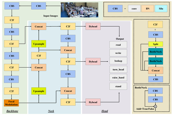 In this section, we present the improvements we made for one specific task of classroom student behavior recognition. We cover the theoretical foundations and the specific process of improving the algorithm. Our model involves five main components: input, backbone, neck, head, and output. We first input a single frame image in the classroom context into the model, resize it to 640 × 640, and then perform initial feature extraction via the Backbone, followed by further extraction and fusion of features at the Neck layer to provide richer information for subsequent prediction, and finally, the output of seven different behaviors via the Dyhead target detection head. The overall structure of the model is shown in Figure 1.