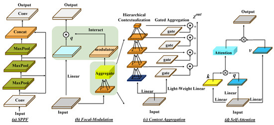 We found that in tasks such as student classroom behavior detection, there are a variety of scenarios with varying sample sizes of different student behaviors as well as more complex classroom environments, which often lead to less effective detection models. Many researchers consider introducing self-attention mechanisms [40] to alleviate this problem in such situations. Self-attention mechanisms are widely used in visual tasks, but their computational complexity is high, especially when dealing with high-resolution inputs. Therefore, we decided to introduce the Focal Modulation technique [41], a relatively lightweight network structure, as a direct replacement for the traditional SPFF module to further limit the complexity of the model, thus guaranteeing the real-time performance of our detector and ensuring that it can be applied to real classroom environments.The Focal Modulation is mainly a multilevel feature fusion mechanism that is incorporated into the module to learn both coarse-grained spatial information and fine-grained feature information in the classroom environment, and acquiring student behavior information from far and near, thus improving the model performance, as shown in Figure 2. Focal Modulation can also increase the focus on hard-to-detect targets (behaviors with small sample sizes in the dataset) and achieve focus on difficult samples, i.e., special behaviors, thus improving the detection accuracy of the model.