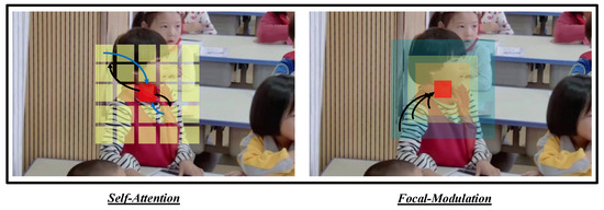 where represents the aggregation operation performed on the attention score matrix between the query and its targets, and is the interaction between the query and targets. In contrast, the process of focal modulation is expressed as follows: