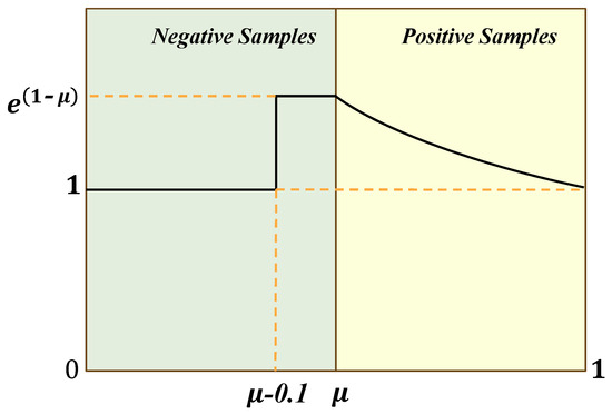 However, due to unclear classification, samples near the boundary often suffer significant loss. We hope the model can learn to optimize these samples and make full use of them to train the network. However, the number of such samples is relatively small. Therefore, we attempt to assign higher weights to difficult samples. First, the samples are divided into positive and negative samples using the parameter , as shown in Figure 5. Then, the boundary samples are emphasized through the weighting function Slide. The specific process of the Slide weighting function is as follows: