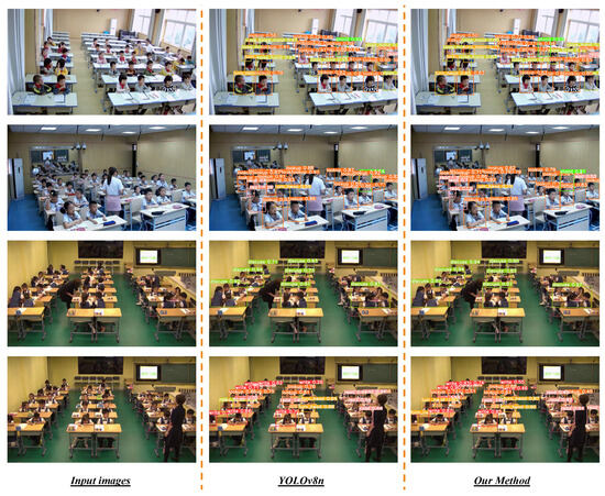 For example, Cao et al. proposed a student behavior detection model based on an improved SSD algorithm that integrates the Mobilenet architecture, designed for real-time behavior detection in dynamic classroom environments [24]. Their model combines two different approaches to enhance detection capabilities, particularly for classroom behavior. Additionally, Li et al. introduced an innovative method using an attention mechanism and relational reasoning module specifically suited for complex classroom environments, improving the detection of human–object interaction behaviors [25]. Furthermore, Chen et al. presented a model based on an improved YOLOv8, incorporating a multi-head self-attention mechanism, which showed greater robustness and accuracy in classroom scenarios [26].