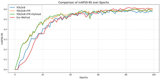 In our research, to enhance the model’s performance in detecting small targets, such as the heads of students seated at the back, we incorporated a combination of the Focal Modulation module and the Scale-aware Attention from the Dyhead module. This integration significantly boosts the model’s capability in feature extraction and fusion under complex classroom environments, thereby enhancing the detection accuracy for occlusion and small objects. Specifically, Focal Modulation employs a multi-level feature fusion mechanism that aggregates context information from short to long distances across different positions in the feature map. Through deep convolutional encoding, the FM module focuses and merges features from various scales at each query location, capturing fine local details. Subsequently, when the model makes inputs into the Dyhead module, its Scale-aware Attention dynamically adjusts the importance of different scale features. Using 1 × 1 convolution operations, Dyhead’s Scale-aware Attention allocates attention weights based on the prominence of different scales in the feature maps, enabling the model to focus more on extracting features of occlusion and small objects.