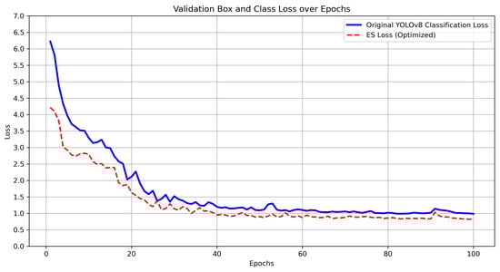 In the training process of machine learning and deep learning models, the performance of the loss function is an important indicator of the training effect of the model, as shown in Figure 11. In this paper, we analyze the effect of the optimized ES Loss and the classification loss (cls loss) that comes with YOLOv8 by comparing the changes in the two over 100 training cycles (epochs). The graphs show the trend of the two loss functions, where the red dashed line represents the optimized ES Loss and the blue realization represents the original classification loss of YOLOv8. We can clearly see that the optimized ES Loss shows obvious advantages in both the stability of model training and the final results, and through further optimization and tuning, the ES Loss has the potential to show stronger competitiveness and better classification performance in more practical applications.