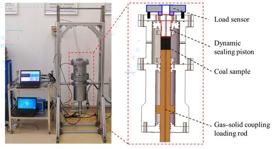 A self-developed three-axis solid–gas coupling test apparatus was used to measure the permeability of the coal under cyclic dynamic and static combined loads, as shown in Figure 1 []. It consisted of four key units: dynamic and static loading unit, three-axis confining pressure unit, fluid injection unit, and information acquisition unit. The challenges of the dynamic–static load combination, high-pressure sealing under dynamic loads, and permeability measurement during the full stress–strain process were solved. The apparatus, through an innovative structural design, incorporated a dynamically sealed piston in conjunction with an integrated loading cylinder, successfully achieving the dynamic and static combined loading of solid–gas coupled coal samples. The calibration of pressure in the experimental equipment was carried out using a high-precision manometer. The calibration pressure range extended from 0 to 60 MPa, and the calibration dynamic load frequency was from 0 to 10 Hz. The accuracy of the permeability measurement was ensured through calibration with a mass flow meter, with a calibration range of 0–50 L/min.