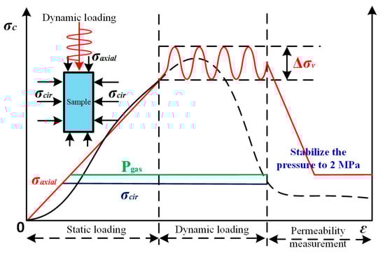 In order to ensure the comparability of the experimental data, a testing loading path was designed, as illustrated in Figure 2. The sample was initially subjected to a predeterminable confining pressure, after which it was infused with a predefined pressure of gas. After the gas adsorption had reached an equilibrium, a static load was applied to the sample until it reached the designated value. On this basis, a cyclic dynamic load was applied with the predetermined amplitude and frequency. After the dynamic loading disturbance ended, it was returned to the uniform predetermined stress state of 2 MPa, and we conducted the permeability test.