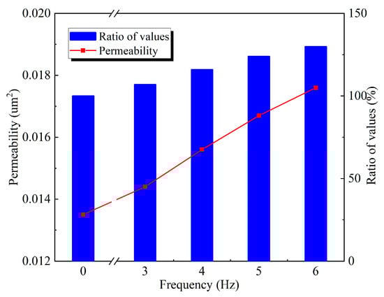 The variation in coal permeability with the frequency of cyclic dynamic loading is illustrated in Figure 3. It is evident that there is a positive correlation between the permeability of the coal body and the frequency of cyclic dynamic loading. To better visualize the variation in permeability with the dynamic loading frequency, we defined the ratio of permeability at a given dynamic load frequency to the permeability without dynamic loading conditions as the ratio of values. When the coal body was undisturbed by dynamic loading, its permeability was approximately 0.0135 μm2. However, after being subjected to cyclic dynamic loading with an amplitude of 2.5 MPa and a frequency of 6 Hz, the permeability increased to 0.0176 μm2, reflecting an increase of approximately 30.1%. The increases in permeability at the other three dynamic loading frequencies were 7.2% (3 Hz), 16.3% (4 Hz), and 23.8% (5 Hz), respectively. It is, therefore, evident that cyclic dynamic loading has a significantly pronounced effect on increasing the permeability of coal bodies. The pores and fractures within the coal mass serve as the primary conduits for gas seepage. Under the continuous influence of cyclic loading, the primary pores and fractures further develop, resulting in an increased permeability. As the frequency of dynamic loading increases, a certain number of secondary fractures will develop, leading to a phenomenon where permeability continues to rise with the ongoing increase in dynamic loading frequency. Moreover, under the influence of cyclic dynamic loading, the gas adsorption equilibrium within the coal matrix is disrupted, further enhancing the gas adsorption and expansion effects. Thus, it is evident that the greater the external disturbance to the coal seam, the faster the gas migration within the seam, making it more prone to abnormal gas outbursts. Simultaneously, for coal seams from which gas can be extracted, external disturbances can enhance their permeability, thereby improving the efficiency of gas extraction. Furthermore, as the load frequency increases, the enhancement of transmittance becomes more pronounced.