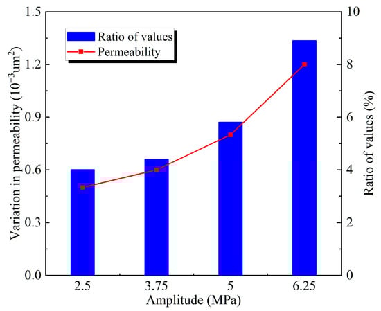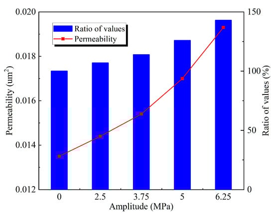 The variation in coal permeability with the amplitude of cyclic dynamic loading is illustrated in Figure 4. It is evident from the figure that the permeability of coal is positively correlated with the amplitude of cyclic dynamic loads. At amplitudes of 2.5 MPa, 3.75 MPa, 5 MPa, and 6.25 MPa, the permeabilities are recorded to be 0.0144 um2, 0.0154 um2, 0.017 um2, and 0.0193 um2, respectively, with growth rates of 7.2%, 14.3%, 26.1%, and 43%. It is evident that the amplitude of dynamic loading exerts a more pronounced effect on the increase in permeability. The reasons for the increase in permeability are fundamentally consistent with those for different frequencies. The sharp 43% increase in permeability at an amplitude of 6.25 MPa is due to the fact that, at this stage, the cyclic dynamic loading is in the yield phase of the coal body stress–strain curve. Consequently, the degree of damage is greater, and the development of fractures is more pronounced. For coal seams from which it is difficult to extract gas, one method employed is to enhance the amplitude of vibrational loading.