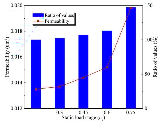 The variation in permeability with the static load stage of the cyclic dynamic load is illustrated in Figure 5. It is evident that there is a positive correlation between the permeability of the coal body and the static load stage. When the static load stages are 0.3 σc, 0.45 σc, 0.6 σc, and 0.75 σc, the permeability of the coal samples is observed to be 0.0137 μm2, 0.0144 μm2, 0.0152 μm2, and 0.0198 μm2, with corresponding growth rates of 2%, 7.1%, 13.1%, and 47.2%, respectively. During the elastic stage of coal, the impact of cyclic dynamic loading on permeability is not significant. This is because, during this phase, the internal damage to the coal body is minimal, and the resulting plastic deformations and newly formed cracks are also relatively few. However, before and during the yield stage of the coal mass, its permeability significantly increases, with a maximum increase of up to 47.2% compared to the permeability without dynamic loading. The reason is that, during this stage, the application of cyclic dynamic loads significantly exacerbates the internal damage to the coal body, leading to the expansion of primary fractures and the formation of numerous secondary fractures. It is evident that, when coal seams are subjected to higher stress conditions, they are more prone to damage and abnormal gas outbursts when disturbed by external dynamic loads.