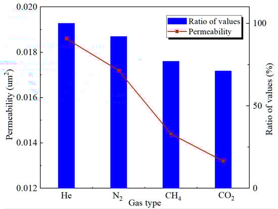 Gas adsorption capacity is measured through gasses at identical pressures but of different types, thereby ensuring the comparability of the permeability results. The adsorption capacity was measured for the following four gases, in ascending order: He, N2, CH4, and CO2. The variation in permeability with the capacity of gas adsorption is illustrated in Figure 6. It is evident that there is an inverse correlation between the permeability of the coal body and the gas adsorption capacity. As the capacity for gas adsorption increases, the permeability of the coal samples is 0.0186 μm2, 0.0172 μm2, 0.0144 μm2, and 0.0132 μm2, respectively. Taking the permeability of the non-adsorptive inert gas He as the baseline, the reductions in permeability for the other three gasses are 8%, 23%, and 29.2%, respectively. Thus, it is evident that gas adsorption exerts an inhibitory effect on the permeability of the coal body. The reason is that, after the coal body adsorbs gas, it undergoes adsorption-induced swelling and deformation. However, constrained by the confining pressure, deformation can only occur inwardly, thereby compressing the internal seepage pathways of the coal body and consequently reducing its permeability. As the amount of adsorption increases, so does the degree of adsorption-induced swelling and deformation, resulting in a more significant reduction in permeability.
