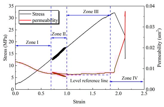 The abrupt increase zone of failure (IV): From the point of the sharp increase in the slope of the permeability curve until the conclusion of the test, this phase corresponds to the peak strength and post-peak phase of the stress–strain curve. During this period, the permeability curve of the coal samples exhibits an almost vertical ascent. Compared to the initial permeability, the permeability at the end of this stage has increased by approximately a factor of two.
