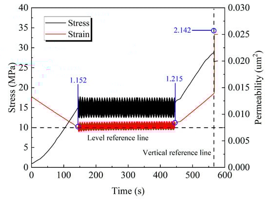 The stress–permeability temporal curve of coal under cyclic loading is illustrated in Figure 8. It is evident that the stress loading curve of the coal body and the variation in permeability exhibit a synchronous resonance pattern. When the cyclic load is applied and the stress returns to its pre-load level, the permeability fails to revert to its original state and actually increases to a certain extent. The reason for this lies in the fact that, during the application of dynamic loading, the internal fissures within the coal body further develop, leading to the widening and proliferation of seepage pathways, which, to a certain extent, increases the permeability of the coal body. Based on the experimental conclusions, it is essential to continuously monitor the gas concentration at the working face during field construction to determine whether mining disturbances have caused a sudden increase in permeability of the coal seam at the working face, thereby minimizing the risk of disasters such as coal and gas outbursts.