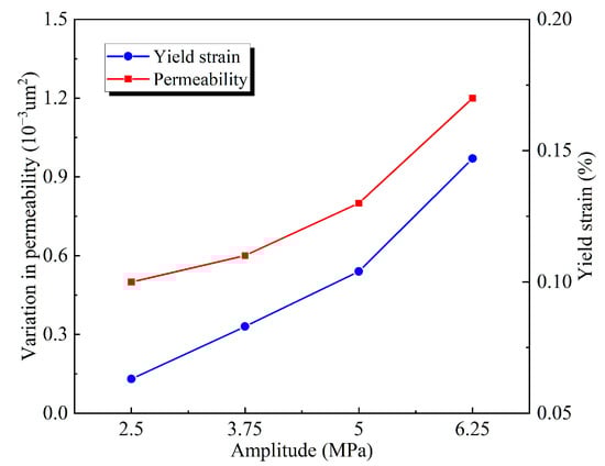 The coupling curve of permeability increases, and the yield strain of coal under different cyclic dynamic loading is illustrated in Figure 10. As the amplitude of dynamic loading increases, the yield strain during the dynamic loading process also grows. This indicates that the coal body is subjected to further compression; however, an increase in permeability is observed. The reason for this is that, during this process, fractures radially expand further, leading to a continuous rise in permeability.