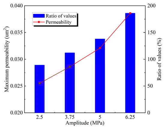 Following cyclic loading, the maximum permeability of the coal body during failure also increases, as illustrated in Figure 11. When the cyclic loading amplitudes are 2.5 MPa, 3.75 MPa, 5 MPa, and 6.25 MPa, the maximum permeability values of the coal body are 0.0255 μm2, 0.0286 μm2, 0.0321 μm2, and 0.0386 μm2, respectively. Compared to the baseline value of 0.0135 μm2, these represent increases of 88.9%, 111.9%, 137.8%, and 185.9%, respectively. It is evident that the application of dynamic loading not only enhances the current permeability of the coal body but also significantly contributes to the increase in its maximum permeability upon failure.