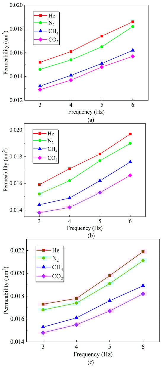 The rate of change in permeability described in this paper refers to the variation in permeability induced by cyclic loading frequencies during the static load phase and with a fixed type of gas.