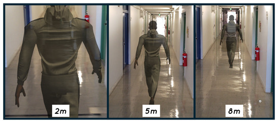 - Distance increase (Spatial Increase, ): This condition uses a gradual increase of 3 m in the distance between the avatar and the user from 5 m to 8 m over a 12 s period. The expected outcome is an increase in the stride length of the user.