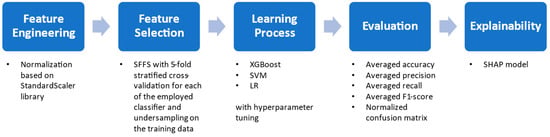All code was implemented in Python, utilizing the Scikit-learn library (https://scikit-learn.org/, accessed on 30 June 2024) for model development, training, and evaluation. This ensured the consistent application of ML algorithms and methods throughout this study. Figure 1 depicts the proposed ML workflow.