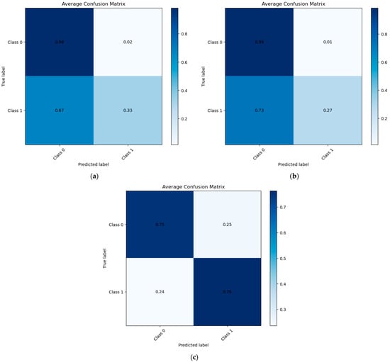Normalized confusion matrixes for (a) XGBoost, (b) SVM, and (c) LR classifiers.