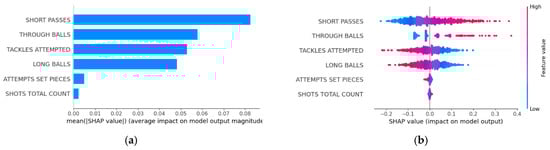 The first SHAP summary plot displays the mean SHAP value for each feature, indicating the average impact of each feature on the model’s predictions (Figure 3a). In this plot, “SHORT PASSES” emerged as the most significant feature, having the highest mean SHAP value. This indicates that the number of short passes has the greatest influence on the model’s output. Other important features include “THROUGH BALLS”, “TACKLES ATTEMPTED”, and “LONG BALLS”, all of which significantly impact the model’s predictions. These features are essential in determining the ranking of teams, highlighting the importance of both offensive and defensive play metrics.