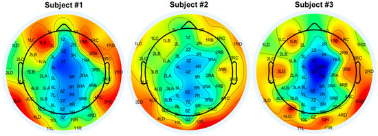 Topographical EEG activity patterns across three subjects showing individual variations in brain activation.