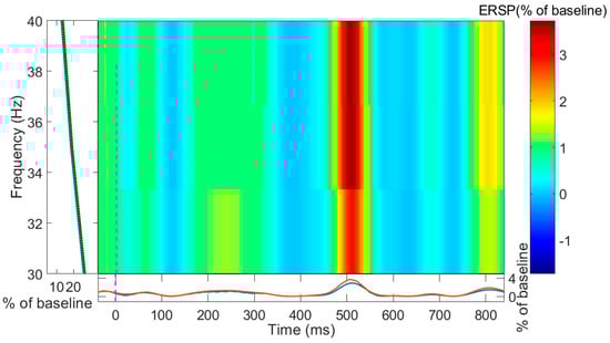 To further analyze the EEG data, ERSP analysis was conducted on the preprocessed data to examine spectral power changes over time and frequency. This analysis employs time-frequency decomposition methods to provide a high-resolution time-frequency representation of the EEG signal. The ERSP analysis examined spectral power changes in the 30–40 Hz range from −100 ms to 900 ms relative to the event, using a −200 ms to 0 ms baseline, with results expressed as percentage changes from baseline power to quantify event-related oscillatory activity in the gamma band. As illustrated in Figure 4, the ERSP plot reveals patterns of spectral power changes across time and frequency within the 30–40 Hz range. The ERSP plot reveals significant gamma band power increases around 500 ms and 800 ms post-stimulus (represented by warm colors), suggesting event-related synchronizations that may indicate heightened neural processing or cognitive engagement, with the later activity potentially reflecting sustained or secondary processing stages.