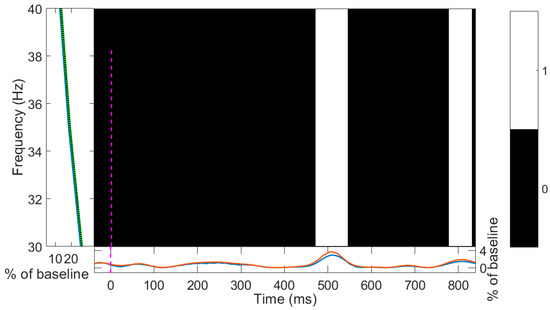 To fully leverage the insights provided by the ERSP analysis, it is crucial to correlate these time-frequency representations with the original EEG signal timestamps. This correlation is achieved by aligning each column in the ERSP plot with specific time points relative to experimental events marked in the original EEG data. By identifying when a feature occurs in the ERSP relative to an event and locating the corresponding event marker in the original EEG data, researchers can pinpoint where spectral changes occur in the continuous EEG recording. This alignment process creates a bridge between the time-frequency analysis and the raw EEG data, enabling an understanding of how spectral dynamics correspond to ongoing EEG activity throughout the experiment. Building upon this time-frequency representation, we developed a method to translate the continuous ERSP data into a binary classification of brain states. For each time point in the ERSP output, we calculated the mean power across the 30–40 Hz frequency range. This frequency-averaged power was compared to a threshold set at the 85th percentile of all power values in the dataset, a value chosen empirically after extensive testing to optimally balance sensitivity and specificity in detecting significant gamma activity. Time points where the mean power exceeded this threshold were classified as ‘1’, indicating high gamma activity, while those below were classified as ‘0’, representing baseline or lower gamma activity states. Figure 5 presents the result of this binary classification, where black regions represent time-frequency points exceeding the threshold, corresponding to periods of high gamma activity.