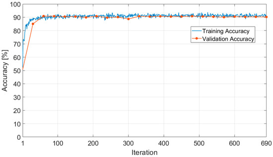 To summarize the table, there is a stark contrast in processing times between the two methods. For preprocessing, our Automatic-CNN approach demonstrates a significant reduction in time across all sample sizes, with savings of up to 68%. The disparity is even more pronounced in the classification phase, where our method completes the task in less than one second regardless of sample size, compared to the traditional EEGLAB method, which requires up to 200 min for larger datasets. These time savings can substantially expedite research processes, allowing investigators to analyze neural activity more efficiently and potentially explore larger datasets or conduct more comprehensive studies within the same timeframe. Moreover, our system incorporates advanced features such as automatic average power calculation and classification, extending beyond EEGLAB’s native capabilities to provide a more comprehensive and efficient analysis. With this preprocessing and binary classification completed, we proceeded to train and evaluate our CNN model on the prepared dataset. Figure 6 illustrates the evolution of the model’s accuracy over the course of training iterations for both the training and validation datasets. The graph demonstrates how the model’s predictive accuracy improves and stabilizes as training progresses, offering insights into the learning process and the model’s ability to generalize to unseen data in the validation set.