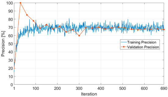 Training and validation precision across iterations for the CNN model in EEG signal classification.