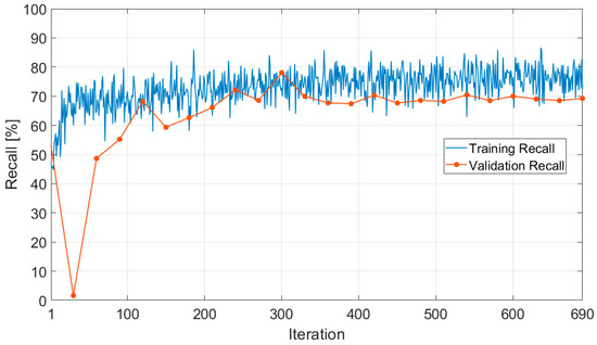 Figure 8 presents the recall scores for both training and validation sets over the course of training iterations. This metric is crucial for assessing the model’s effectiveness in detecting all relevant instances of the cognitive state of interest. The graph allows us to visualize how the model’s sensitivity to positive cases changes throughout the training process, providing insights into its ability to identify the less frequent, but potentially more significant, positive instances.