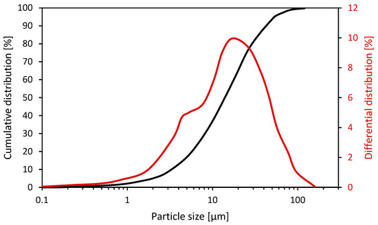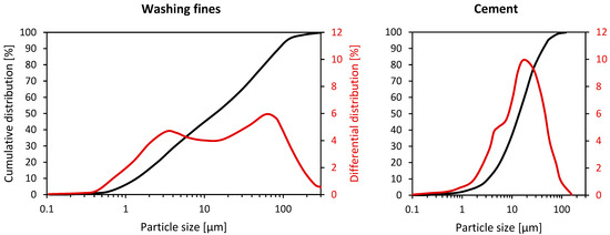 Washing fine particle size distribution compared to cement. Cumulative distribution (black line) and differential distribution (red line).