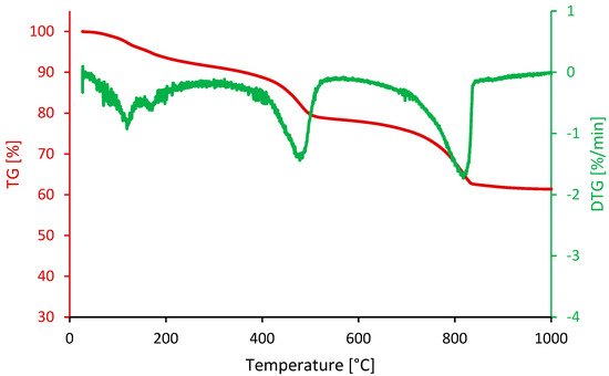 To characterize the thermal stability and composition of these washing fines, thermogravimetric analyses (TGA) were carried out. Measurements were carried out in an inert nitrogen atmosphere, varying the temperature from ambient to 1000 °C, in a Netzsch STA449 F3 Jupiter® furnace (Netzsch Gerätebau GmbH, Selb, Germany). Several critical phases are revealed at different temperature ranges (see Figure 3). Up to 120 °C, a decrease in mass is observed, corresponding to the evaporation of residual free water. Between 120 and 600 °C, another significant mass loss is identified, probably linked to the release of chemically bound water during the decomposition of calcium hydroxide (Ca(OH)2), with a peak between 400 and 500 °C. Finally, a further decrease in mass occurs between 600 and 1000 °C, suggesting the release of carbon dioxide (CO2) resulting from the decomposition of calcium carbonate (CaCO₃), with a notable peak between 800 and 900 °C.