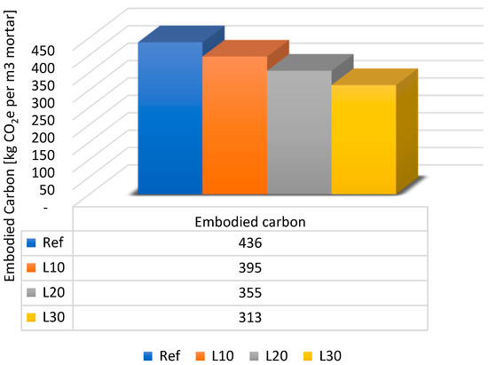 The results in Figure 5 show a significant reduction in carbon footprint with the gradual incorporation of washing fines. Mortar formulations L10, L20 and L30, with 10%, 20% and 30% cement substitution by washing fines, respectively, show carbon footprint reductions of 9%, 19% and 28% compared to the reference formulation (Ref), whose integrated carbon is 436 kg CO2/m3. Thus, integrated carbon values decrease to 395 kg CO2/m3, 355 kg CO2/m3 and 313 kg CO2/m3, respectively, for L10, L20 and L30 formulations.