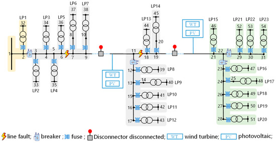 In Figure 4, the yellow area represents normal operation; the gray area represents the fault area, where the load is completely shed; and the green area represents the island operation area. Because there is a disconnector between nodes 2 and 3, the disconnector blows to achieve fault isolation when a fault occurs, which enables LP1 to continue normal operation. The gray area contains faults that cannot be isolated, so it cannot operate normally. The green area is isolated from the distribution network faults by switching isolation switches. During this period, power is supplied by DG with PV and WT units, although their output fluctuates. Therefore, selective load shedding is required for the LV users of LP15-LP23.